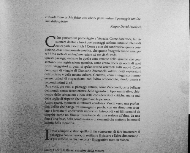 Scrive Elisabetta Sgarbi nel suo commento alle foto di Zucconelli: Grazie all’originale idea di Laura Cicci de Biase, curatrice della mostra, l’esposizione sarà punteggiata da riflessioni, analisi e pensieri inerenti le opere di Zucconelli, scritti da una ventina di esponenti della cultura italiana ed europea. Le parole del poeta Maurizio Cucchi, dello scrittore e sceneggiatore Vincenzo Cerami, del regista Franco Piavoli, della scrittrice Simonetta Agnello Hornby, dell’antropologo Mar Augè e ancora di Milo Manara, Bepi De Marzi, Bob Krieger…, offriranno ai visitatori chiavi di lettura per avvicinare le immagini scattate dal fotografo veronese, per aprire quelle storie che Zucconelli coglie e propone.